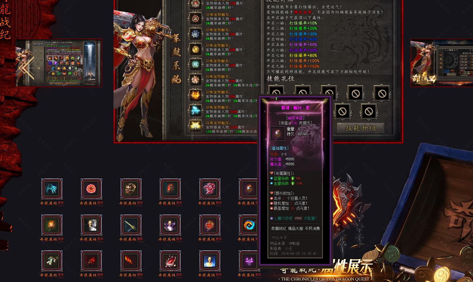 奇龙战纪传奇版七大陆荒兽森林,颠覆传统玩法,登录及NPC界面UI做得好看网站也精美,六大陆猎荒城镇华融帝国,五大陆天书奇录曲天界,四大陆仰光大陆神域等,此端采用翎风LFM2引擎耗时制作,更多细节参考详情图文介绍。物价是灵魂,生态是根本 追梦是目标 公平是核心