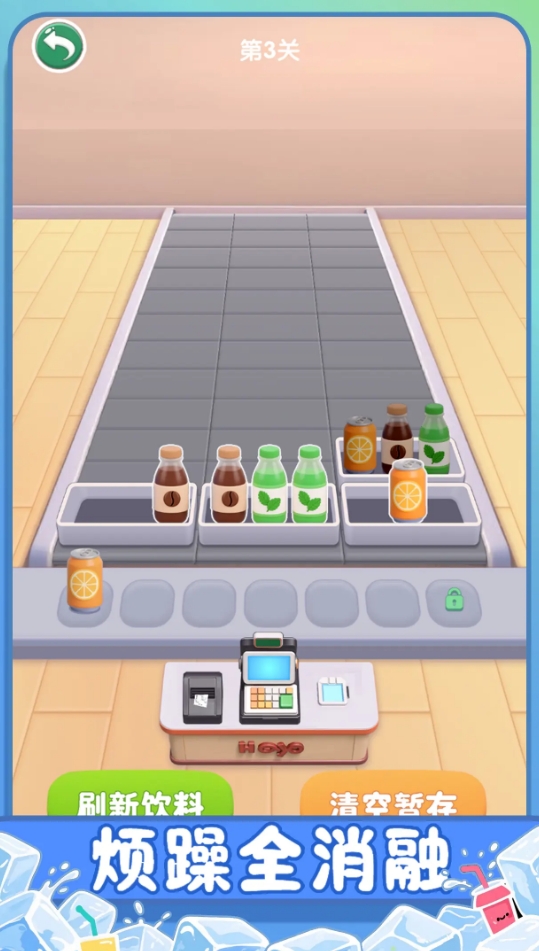 将三瓶同样的饮料放在一起来完成消除,是《冰霜碰碰消》的核心。在游玩时各位只能选中面前一排的饮料,要想选中后边只有将它前面的都拿完才行,好在游戏还提供了一些可临时存放饮料的格子供各位去使用,各位在消除也将获得更大的可操控空间。游戏每道关卡都有不同数量的饮料需要去消除,而且饮料的种类也会逐渐增多,各位也将要认真思考饮料的拿取顺序,确保不会因没临时格子而卡住。