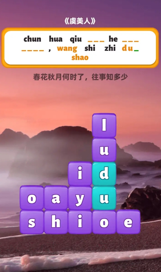以小学拼音为基础的趣味玩法,它会在关卡里向各位提供古诗词的拼音,并让人们选取不同的拼音方格来完成诗句的补全,只要组合出的拼音顺序正确就可过关,让各位一边享受完成关卡带来的快乐,又能更好地去记住这些意境绝美的诗句。而且以拼音形式的拼词玩法对刚学习完拼音的孩子来说并不会很难,即便他们不会写也不认识这些诗句,依旧能通过读音来完成拼写,帮他们巩固拼音基础。