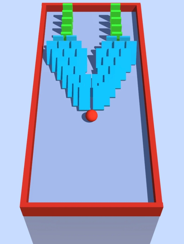 像打保龄球那样将平台上的所有方块击倒吧。每道关卡都会为玩家布置不同的方块摆法,并且加入了真实的物理碰撞规律。如果方块受到小球和其他方块的撞击,它们也会失去平衡而直接倒下,玩家可以利用这一机制来完成对所有方块的击倒。要注意,每道关卡只有一次机会,如果不能在一次撞击时将所有的方块击倒,就只能重新再来过。