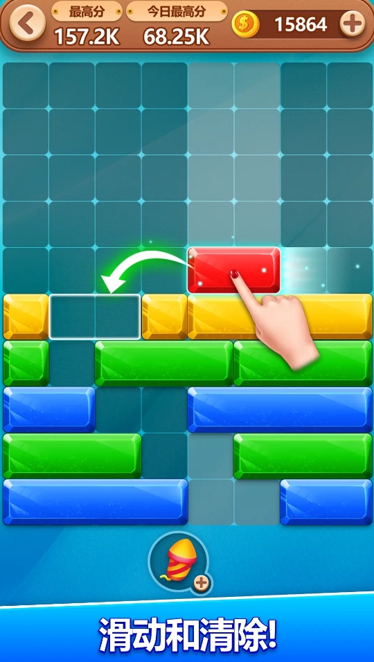 通过使用滑动的方式,用大小合适的方块将横行补齐,以此来完成对横行的消除。方块都可随意移动,只要玩家将关卡内的方块全部消除,就能达成过关的条件。每一关的方块摆法都不同,而且花样繁多,给玩家带来极佳的游戏体验。同时,还有一些实用道具可以提高消除效率,或指定某一方块进行清除等,只要获得就可以在任何时候使用。