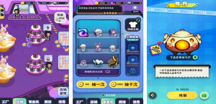 经营游戏对于玩家来说是吸引力比较强的,通过继承一家盲盒店,玩家就可以开一家盲盒店铺,在这里可以选择各种不同的盲盒机器,还需要根据市场的流行风向挑选对应种类的盲盒,接着玩家就可以在游戏里不断捕获收银,玩家也能亲自在游戏里抽取盲盒,每个机器都要设定最合理的价格,这样才能吸引更多的顾客,玩家的店铺也才能持续的经营。