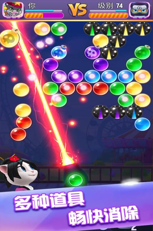4、《汤姆猫泡泡射手》:以泡泡龙为创作灵感,植入了汤姆猫系列标志性的色彩。玩家操作炮台,根据珠子的颜色分布位置变换珠子进行射击,过程中还会触发Boss大战的事件。完成章节后,可以解锁新的角色。