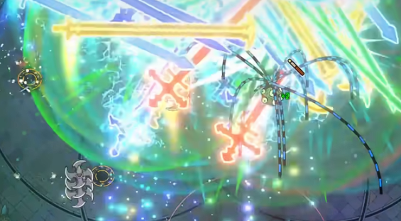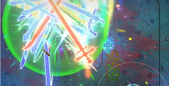 但是,仅仅拥有破魔剑还不够。接下来还有一个放大镜,玩家在拿到后立即会发现破魔剑的体型迅速变化,很快就会成为一把巨剑。重点是,一旦变成巨剑后,效果直接提升100%,无论是打伤害还是抵挡弹幕都很给力。等到巨剑成型后,最后一个关键就是补全配件。在这里也需要使用分裂魔法,一次性释放出多把剑,然后加上一些元素伤害,例如火属性和雷属性,可以迅速提升输出能力。