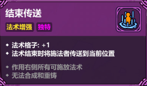 在这个流派中,玩家可以发现一个独特的法术——结束传送。该法术在施法结束时可以直接将施法者传送至当前位置,这种机制本身就是自带的。经过尝试后发现,在传送过程中不会直接打断站立姿势,这为玩家打通思路提供了便利。如果能一直保持站立姿态并迅速施法输出,就能实现无敌状态。然而,也出现了一个新的问题:如何使用传送躲避伤害而不是进行大范围输出。