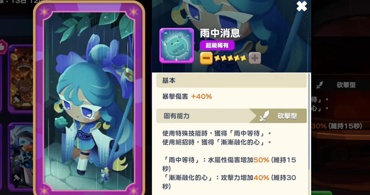 为了打出满输出、满暴击,必须要注意蓄力攻击必须命中目标叠加层数,满5层攻击力翻倍持续15秒。连招推荐蓄力然后接黑暗剑击,最后就是必杀技。在BOSS战前3秒蓄力启动层数。法宝卡选雨中消息,蓄力命中增暴伤25%。阵容搭配白玉草饼干治疗+牛奶饼干护盾,理论上满配全输出效率非常高。但是不带辅助很难叠满层,阵容搭配非常重要。培养优先级先升技能,然后法宝,最后是等级,优先升奔流激浪和波涛奔腾,把控蓄力时机,确保层数不中断。虽然操作需要练习,但练熟后她就是输出核心。