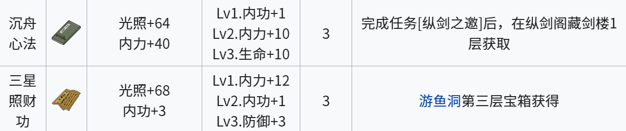 沉舟心法和三星照财功的武学上线等级都为3级,沉舟心法能够增加40点的内力和64点的饿光照,大家只要把纵剑之邀的人物完成就可以前往纵剑阁获取了,三星照财功只能提升3点的内功,光照能够提高68点,玩家可以在游鱼洞的第三层中获取。