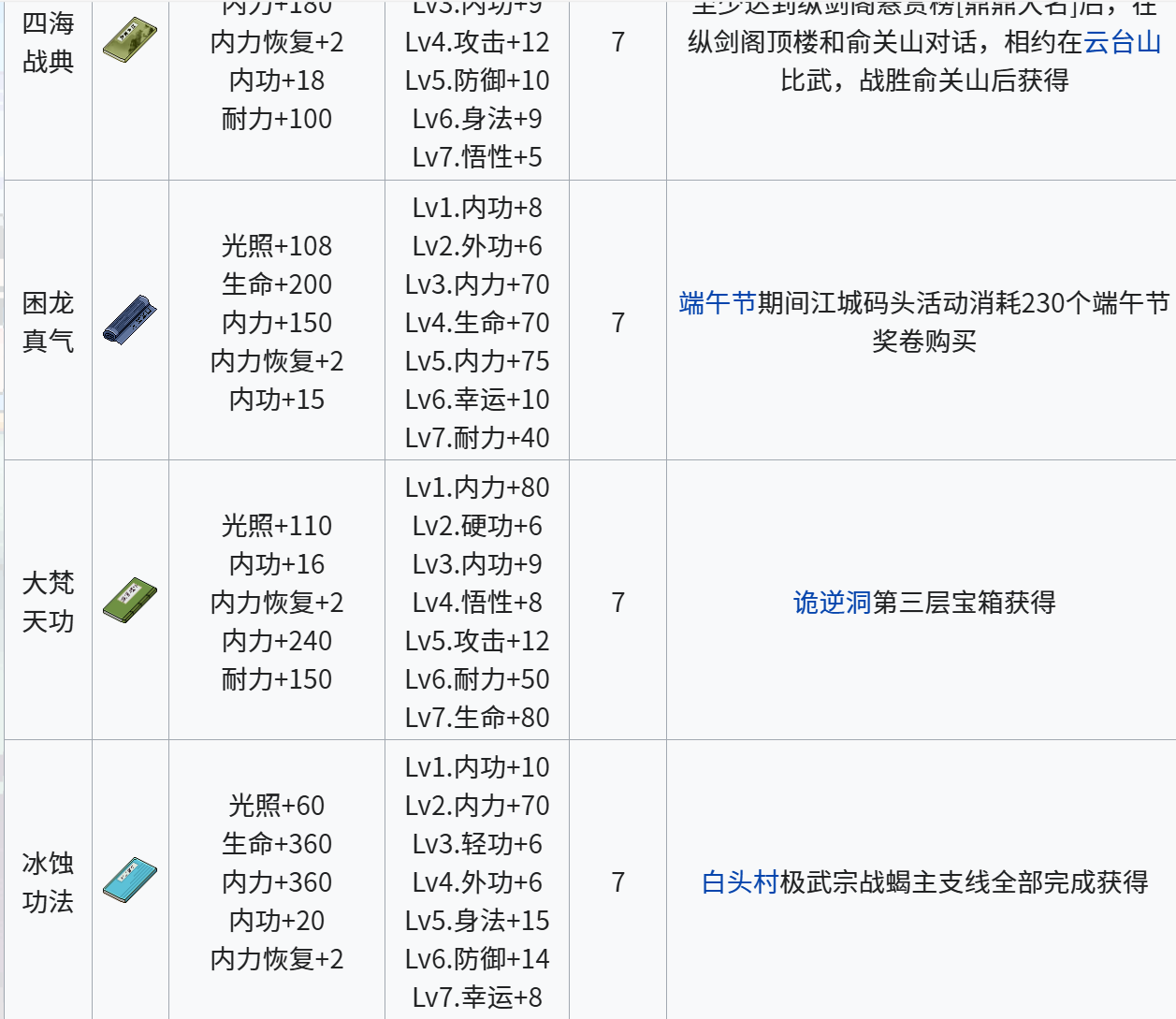 四海战典、困龙真气、大梵天功和冰蚀功法等内功能够提升到7级,这四本功法在内功中都属于高品质一类的功法了,功法提升的内功、内力都与之前的几类功法有着本质上的差距,不过获取上难度也就更高一些,比如说四海战典这本功法,大家想要获取的花,需要先在纵剑阁的悬赏帮中达到鼎鼎大名的评定,然后在几把俞关山才能获得。