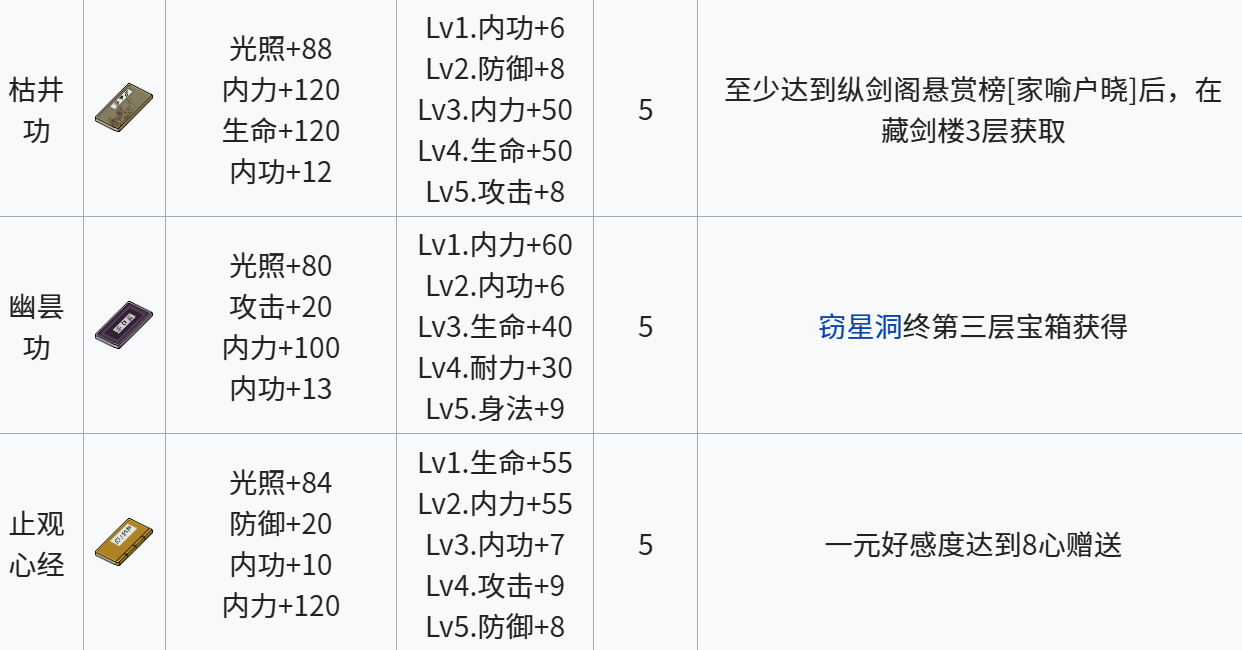 幽昙功、止观心经和野夫真经的等级上限是5级,这三本功法不仅能够给光照、内力以及内功增加不同的点数以外,幽昙功还增加了20点的攻击力,止观心经防御力会增加20点,野夫真经则是耐力增加100点,内力恢复还会增加2点。