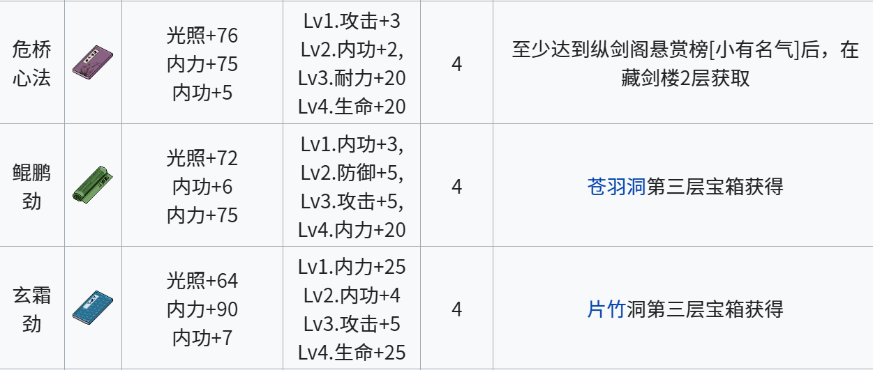 危桥心法、鲲鹏劲、玄霜劲这三本内功的等级上限是4级,危桥心法修习后光照增加68点、内力加75点、内功加5点,鲲鹏劲则是光照加72点、内力加6点、内功加75点,玄霜劲能增加64点光照、90点内力以及7点内功。