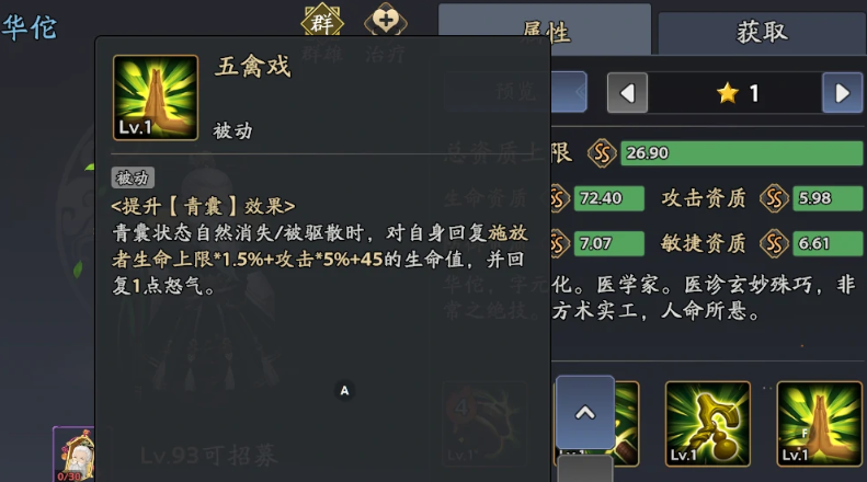 最后一个技能也是被动效果,这个技能叫做五禽戏,跟他自身的青囊状态有关,这个状态使用完即将要消失的时候,在上面就会带来一定的回复,此时的回复是在他自身的生命数值上面,会得到+1怒气数值的回复,所以在大招循环的时间上面有这个技能就会更快一些,所以在后期五禽戏这个被动其实是最推荐大家去培养起来的,大家可以把这个效果看成是华佗的核心机制,后期升级到满级之后回复怒气的数值,最高是可以提升到50%的,而且他其他的技能,比如说大招的治疗量也跟自身的青囊状态有关,大招触发的概率一样是会跟随技能等级提升的。