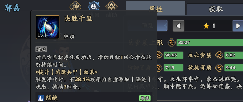 以上就是本期关于《三国志异闻录》中神将品质武将郭嘉的介绍。了解了他的技能机制后,可以根据这些信息来研究如何更好地利用郭嘉。希望这能帮助大家更好地运用郭嘉这一谋士角色。
