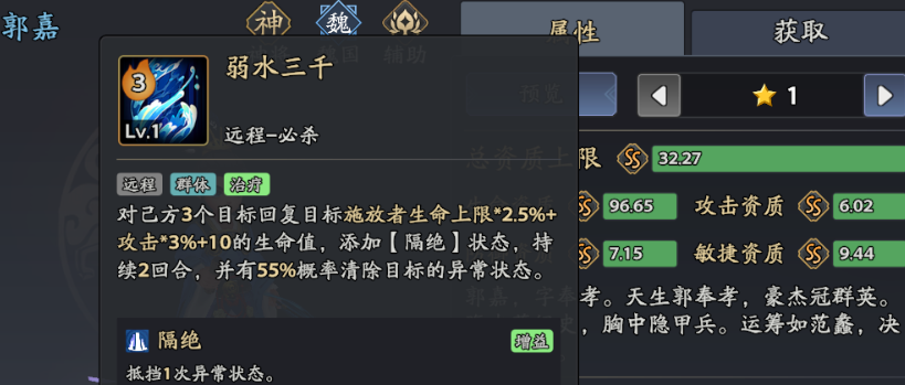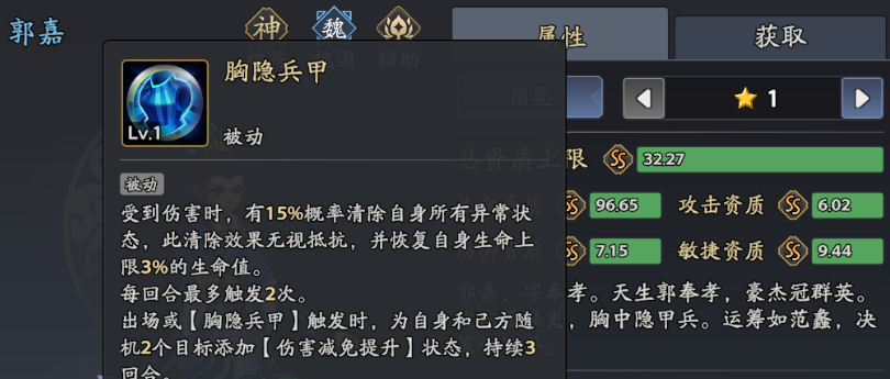如果大家希望在《三国志异闻录》中利用谋士类型的武将,本期将介绍一个神将品质的武将——魏国的辅助角色,他就是谋士郭嘉。作为游戏中的一个智力型武将代表,郭嘉不仅在群体战斗中提供支援能力,还能为队友带来强大的防护效果。在游戏中想要充分利用郭嘉的作用,需要理解他的技能。