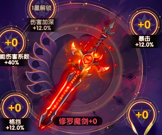 第一个圣物是修罗魔剑,自带5个槽位。这些槽位可以分别提升伤害、魔法格挡、暴击、抗暴击和技能加持等效果。此外,该装备还可以提供20%的技能伤害增益,释放技能后还能获得额外增伤。对于输出或暴击流的团队来说,这是一件必带的圣物,能显著提升整个团队的属性效果。
