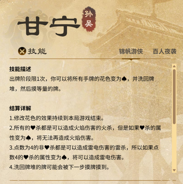 尽管甘宁表面上只有一个简单的主动技能,但该技能内部包含多重规则变化,涉及手牌花色重置、属性转换以及后续连锁效应等多个层面。这使得他在实战中不仅仅是输出型角色,更是一位能通过操控牌堆趋势来主导节奏的战略型人物。