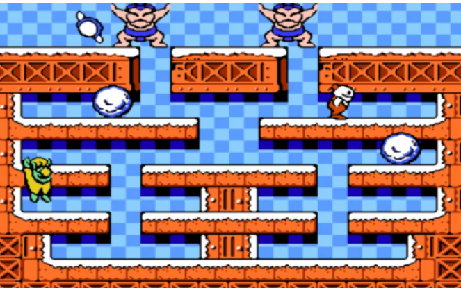 这款双人操控小雪人冒险的闯关游戏也是红白机代表作,罕见双人竖屏卷轴闯关的机制令本作更具特色,随机掉落的加分道具跟buff药水更是本作的精髓,两个玩家可同时使用雪球攻击对抗关卡敌人,本作也是拥有罕见隐藏关卡的闯关类游戏之一,双人解救公主的游戏剧情设定深入人心,每隔五个关卡还可以进行抽奖获取积分与道具,利用投掷雪球、推雪球方式进行战斗闯关的设定很硬核。